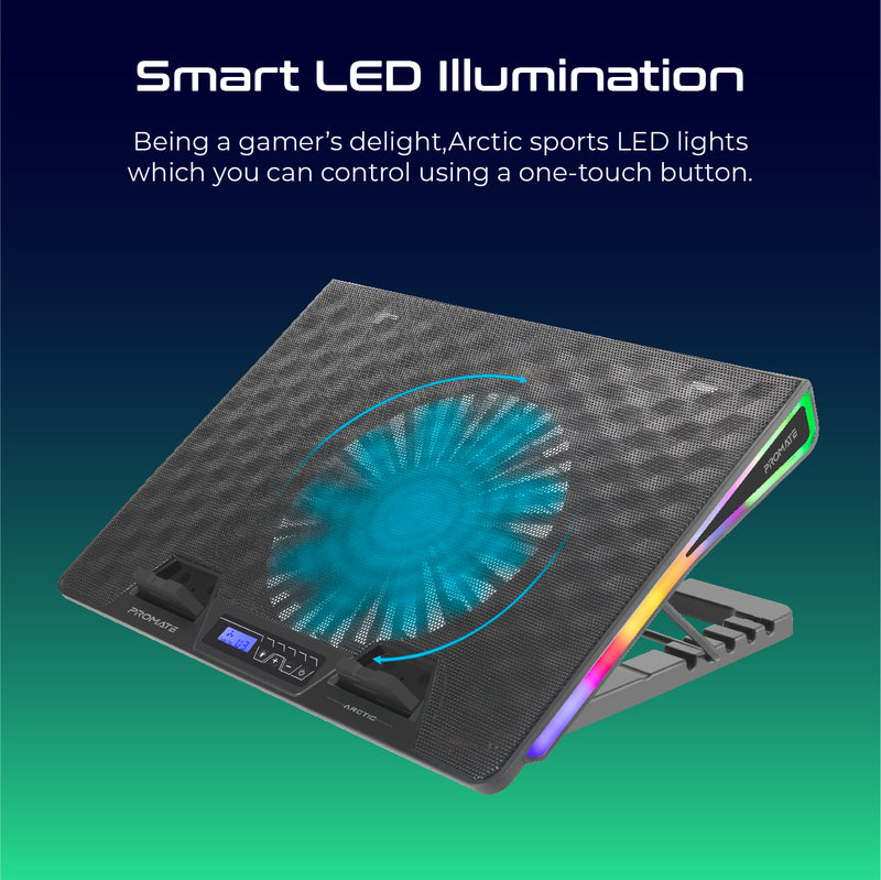 Vertux Arctic Portable Height Adjustable RGB Gaming Cooling Pad, Foldable 17 Inch Laptop Cooler Fan Stand, Small LCD Screen, Dual USB Port, Built-In Controls & Smart LED, Black