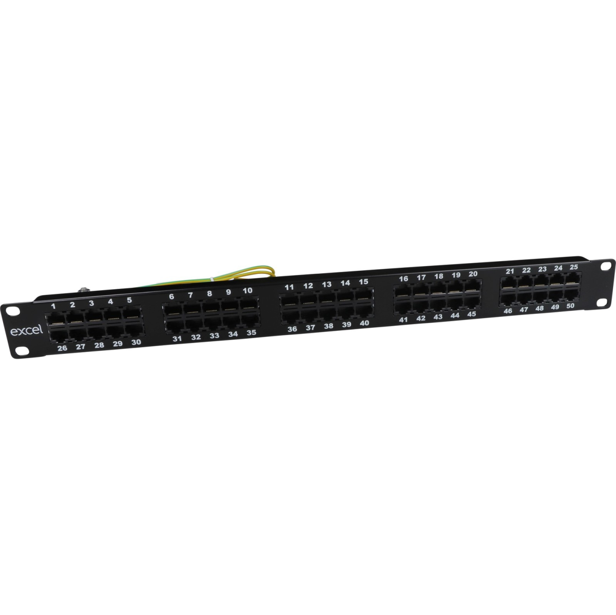 100-464 EXL C5E 1U 50PT UTP 3PR P/P BE The Excel high density RJ45 patch panel is designed specifically for use with high pair count voice multipair cables, such as the Category 3 or CW1308 products found within the Excel cable range. A standard 1U panel frame is populated with up to 60 ports – 50 and 25 port options are also available. Each style of panel has an integral rear cable management tray positioned at a right angle to the panel front. As well as providing a stress free area in which to dress the multiple pairs, the tray also houses the LSA compatible termination blocks.