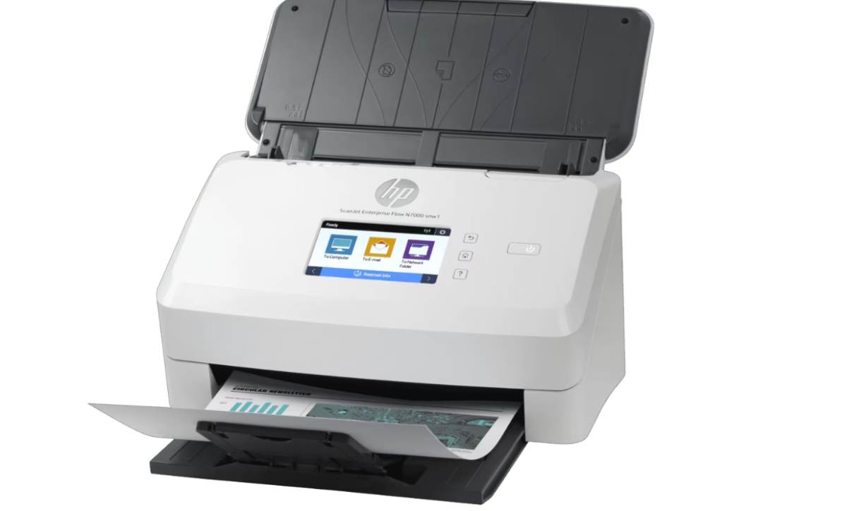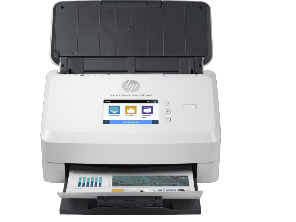 6FW10A HP ScanJet Enterprise Flow N7000 snw1 Scanner Sheetfed Up to 600 dpi Up to 75 ppm/150 ipm Ethernet 10/100/1000 Base-T, USB 3.0, WiFi 802.11 b/g/n, WiFi Direct Recommended daily duty cycle: 7500 pages Handle large volumes at blazing speeds—up to 75 ppm/150 ipm. Recommended for 7500 pages per day. Built-in software and an 80-page automatic document feeder deliver smooth paper handling.