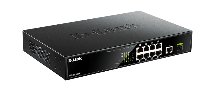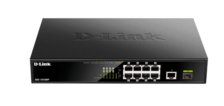 D-Link 10-Port Gigabit PoE Switch DGS-1010MP The D-Link DGS-1010MP 10-Port Gigabit PoE Switch is an ideal solution for small offices and enterprise environments looking to expand the network with Gigabit connectivity. With eight Power over Ethernet (PoE) ports, you can power more PoE-capable cameras, access points, and VoIP phones using standard Ethernet cabling. And its one Gigabit Ethernet and one SFP uplink port allow for additional connections to storage or an uplink network.