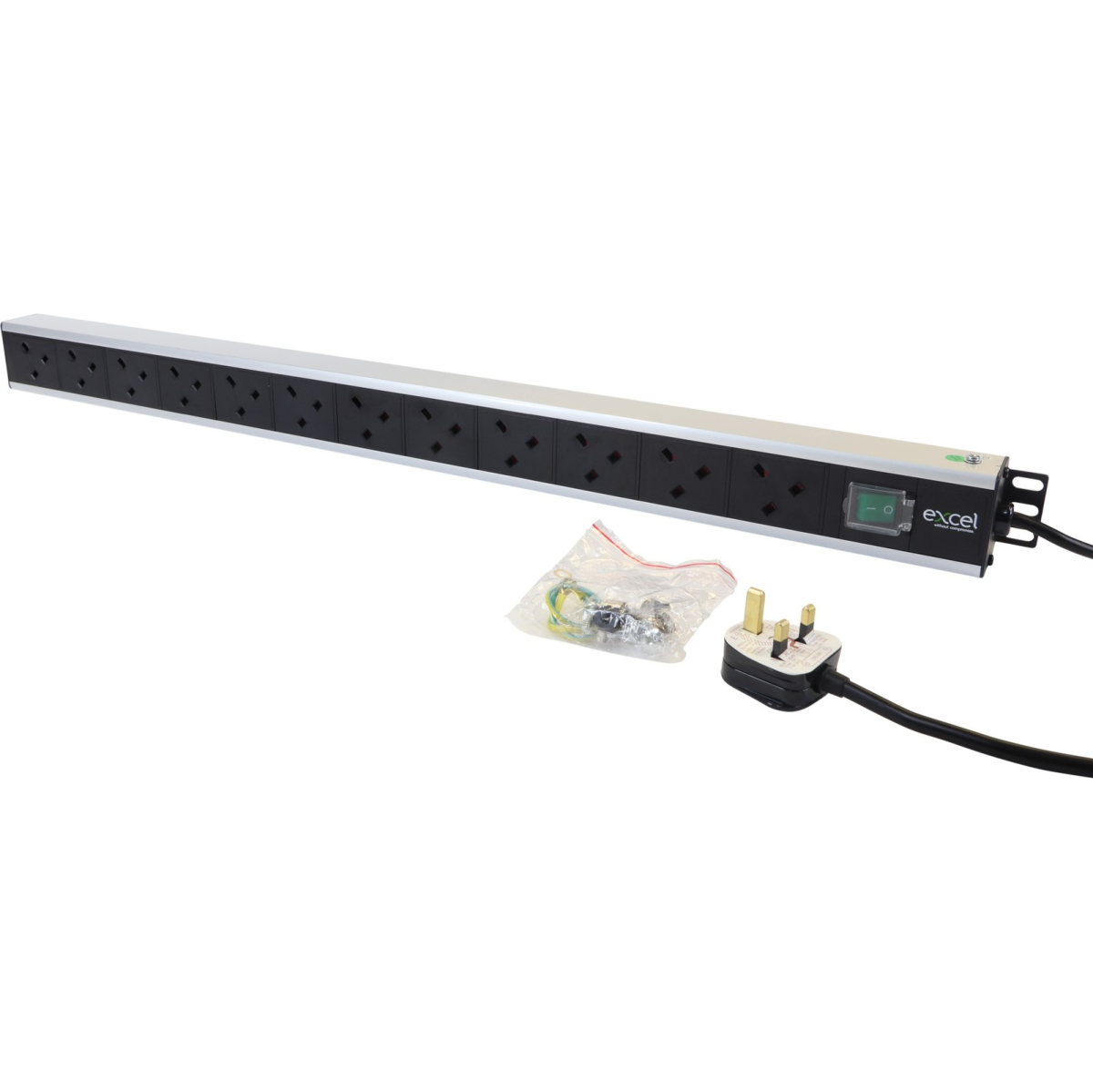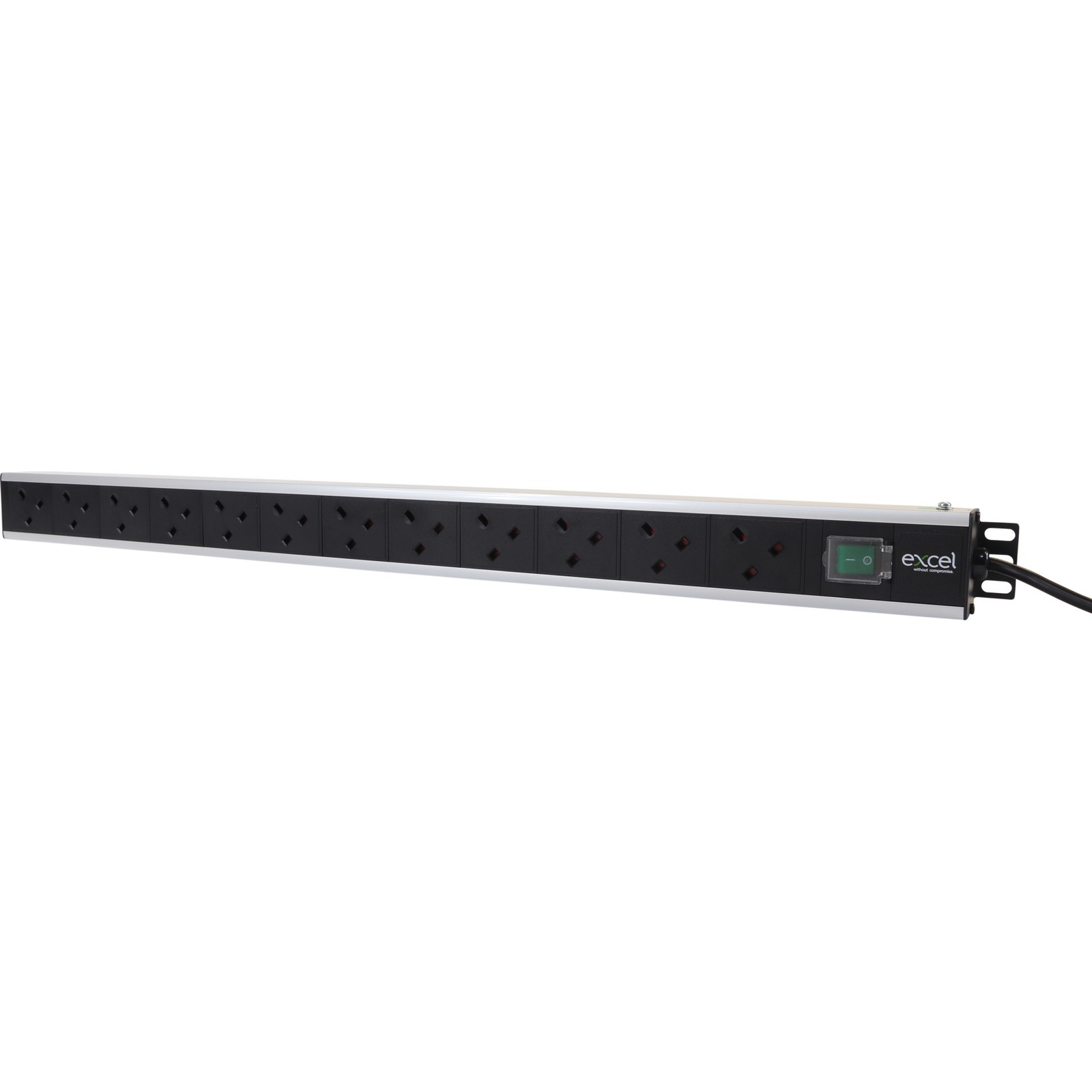 D13-12-EXL EXCEL POWER STRIP 12 WY VERT The Excel range of power distribution units are designed for installation and use within 19″ networking cabinets and enclosures. Each unit comprises a high quality aluminium extruded housing into which are loaded up to 12 sockets. In this particular range each socket is UK style, manufactured in accordance with the BS1363 standard, the 3 metre input lead is terminated with a 13Amp rated 3 pin BS1363 plug top. The sockets are mounted at a 45° angle on the vertical PDUs and a 90° angle on the horizontal PDUs to aid with cable management.