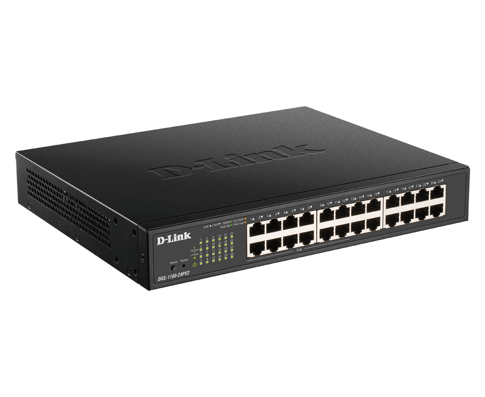 DGS-1100-24PV2 D-Link 24-Port Gigabit PoE Smart Managed Switch (100W PoE Budget) 12 x 10/100/1000Base-T Ports 12 x 10/100/1000Base-T PoE Ports 100W PoE Power Budget Fanless design for silent operation Bandwidth Control ensures latency-sensitive traffic always gets the bandwidth it needs