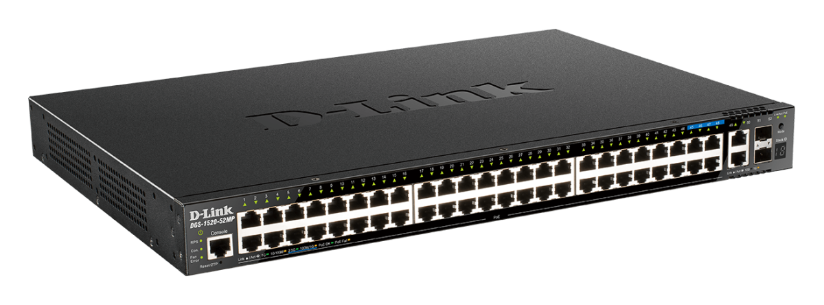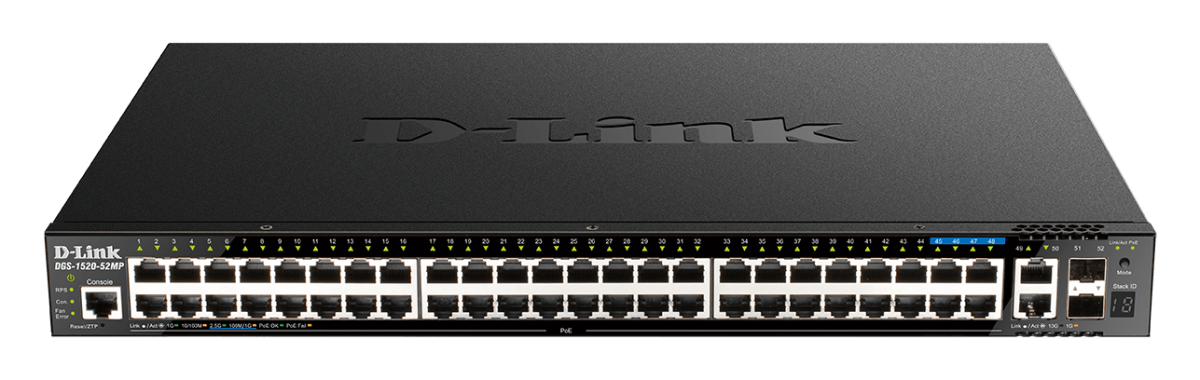 DGS-1520-28MP D-Link 28-Port Layer 3 Stackable Smart Managed Switch 4 x 10 Gigabit ports for stacking and uplink 4 x 2.5 Gigabit PoE ports, ideal for Wi-Fi 6 access points (PoE models only) Highly reliable and expandable network with physical stacking Advanced L2 and L3 features