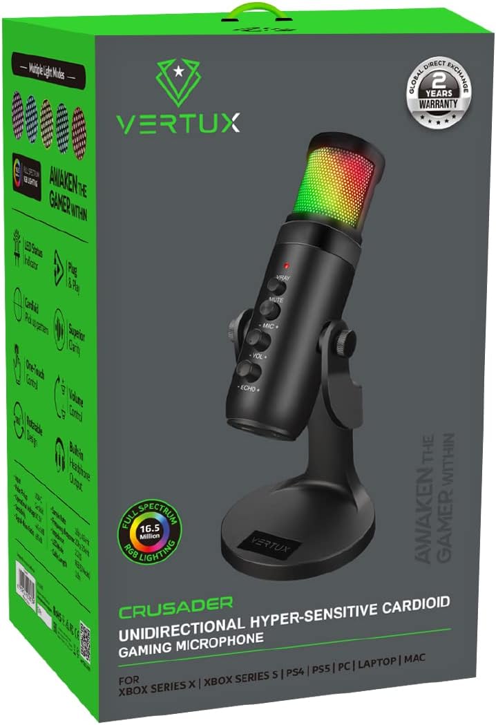 Vertux Unidirectional Hyper Sensitive Cardioid Gaming Microphone USB Condenser Gaming Microphone | [2 Years-Warranty] PC, PS4 and Mac | Multi LED Light Effect – Black