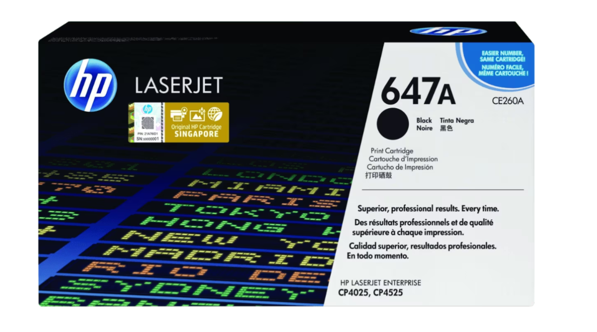 CE260A HP 647A Black Original LaserJet Toner Cartridge Cartridge Colors: Black Print Technology: Laser Page yield black and white: ~8,500 pages Product type: Standard Capacity Toner Cartridges
