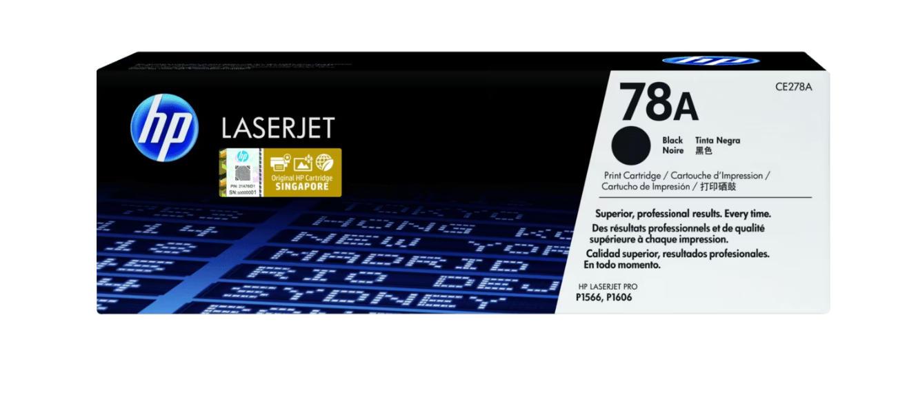 CE278A HP 78A Black Original LaserJet Toner Cartridge Cartridge Colors: Black Print Technology: Laser Page yield black and white: ~2,100 pages Product type: Standard Capacity Toner Cartridges Original HP Toner Cartridges High-volume professional prints at an extremely low cost. Uniquely engineered to deliver outstanding quality, reliability, and value. Sharp, Vibrant, Reliable Printing Better Printing, Less Worry Secure & Simple Printing