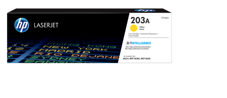 CF542A HP 203A Yellow Original LaserJet Toner Cartridge Print all your business documents quickly and efficiently and match the performance of your HP Color LaserJet Pro with Original HP Toner cartridges with JetIntelligence. Rely on HP quality and reliability for impressive printing results. Print all your business documents quickly and efficiently and match the performance of your HP Color LaserJet Pro with Original HP Toner cartridges with JetIntelligence. Rely on HP quality and reliability for impressive printing results.