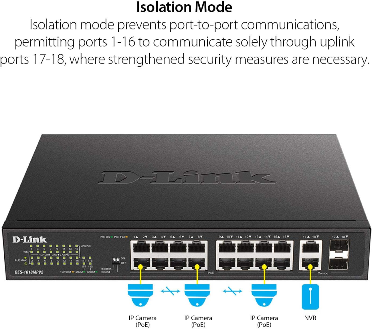 Multiple Port Modes – Extended Mode provides up to 250 m long reach PoE connectivity while Isolation Mode prohibits port-to-port communication, which is ideal for surveillance networks