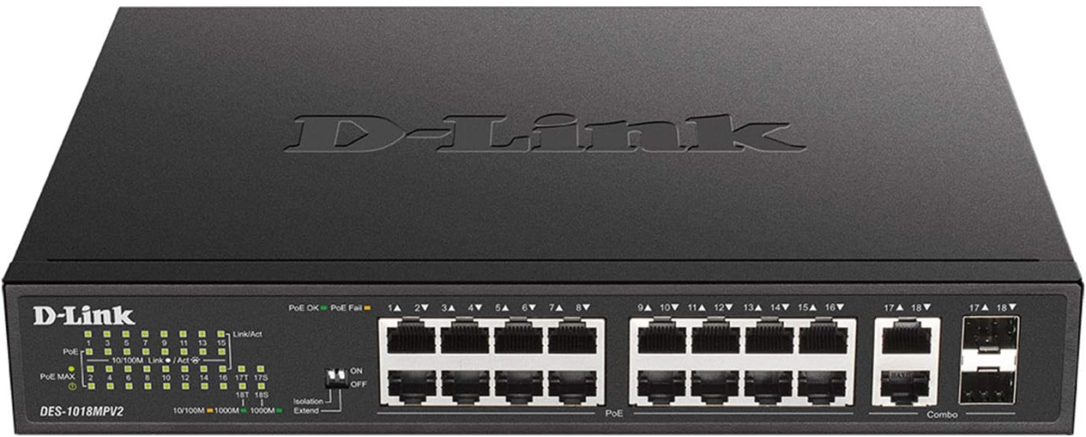 DES-1018MPV2 D-Link 18-Port Fast Ethernet PoE Unmanaged Desktop Switch Brand D-Link Number of Ports 18 Included Components Device, Power Supply, QIG Color Black Compatible Devices Desktop