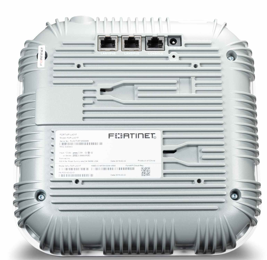 FAP-U431F-E Fortinet FortiAP-U431F Wireless Access Point 4×4:4 MIMO IEEE 802.11ac Wave 2 300 Mbps throughput (2.4 GHz) 4.8 Gbps throughput (5 GHz) 2x PoE-PD (IEEE 802.3at PoE+, 25W (Redundant PoE ports)) 1x 1-GbE-RJ45, 1x 2,5-GbE-RJ45