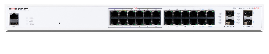 FS-124F-POE FortiSwitch-124F-POE L2+ managed POE switch with 24GE ports, 12 of which are POE+, 4 SFP+, max 185W limit and smart fan temperature control The FortiSwitch Secure Access family delivers outstanding security, performance, and manageability. Secure, simple, and scalable, FortiSwitch is the right choice for threat-conscious businesses of all sizes. Tightly integrated into the Fortinet Security Fabric via FortiLink, FortiSwitch can be managed directly from the familiar FortiGate interface. This single pane of glass management provides complete visibility and control of users and devices on the network regardless of how they connect. This makes the FortiSwitch ideal for SD-Branch deployments with applications that range from desktop to data center aggregation, enabling businesses to converge their security and network access.