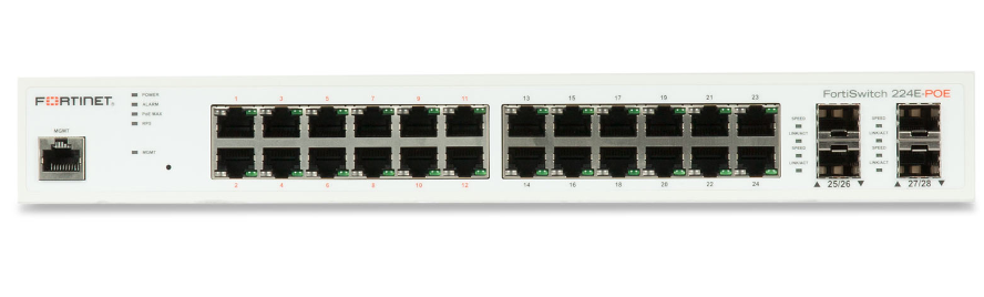 FS-224E-POE FortiSwitch-224E-POE Layer 2/3 FortiGate switch controller compatible PoE+ switch with 24 x GE RJ45 ports, 4 x GE SFP, with automatic Max 180W POE output limit24x 1-GbE-RJ45, 4x 1-GbE-SFP 12x IEEE 802.3at PoE+ (180W) 56.0 Gbps Switching Capacity 16,000 MAC-Addresses 4,000 VLANs