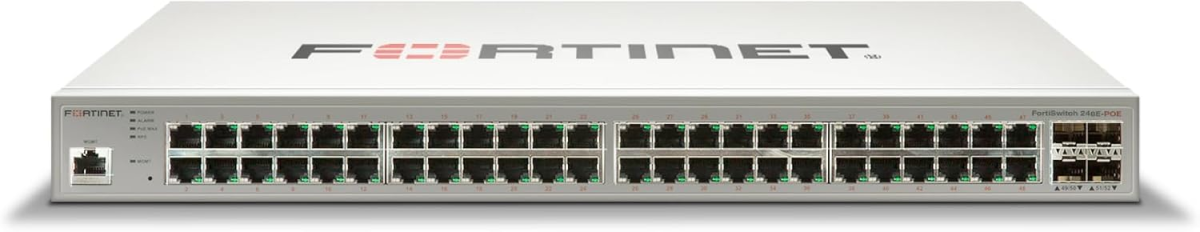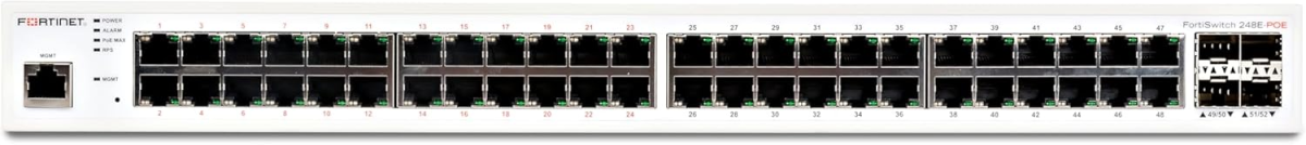 FS-248E-POE FortiSwitch-248E-POE Layer 2/3 FortiGate switch controller compatible PoE+ switch with 48 x GE RJ45 ports, 4 x GE SFP, with automatic Max 370W POE output limit Tightly integrated into the Fortinet Security Fabric via FortiLink, FortiSwitch can be managed directly from the familiar FortiGate interface. This single pane of glass management provides complete visibility and control of users and devices on the network regardless of how