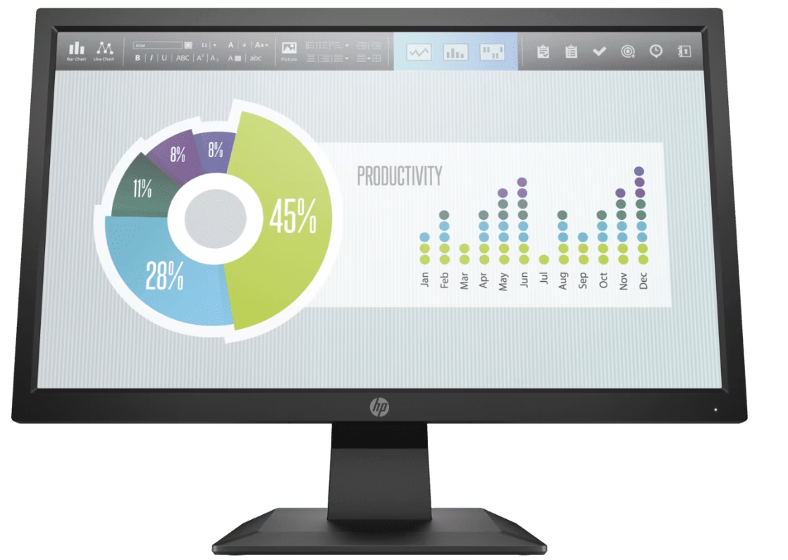 HP 19.5″ LED Monitor P204V 5RD66AA HP P204v 49.53 cm(19.5) Monitor (5RD66AA) Get essential presentation features and device connectivity with the stylishly redesigned and surprisingly cost-conscious HP P204v 49.53 cm(19.5) Monitor. Display size (diagonal): 49.6 cm (19.5″) Response time (typical): 5ms GtG (with overdrive) 1 Native resolution: HD+ (1600 x 900) (VGA or DisplayPort 1.2 or HDMI 1.4 required to drive panel at its native resolution.) Contrast ratio: 600:1 1 Key Features: Crisp image clarity for all your content Easily navigate your documents and spreadsheets on this sleek display that complements your modern workspace and has a 49.53 cm(19.5) diagonal screen with 1600 x 900 resolution. Display and device connectivity Quickly connect to your devices and additional displays through the HDMI connector. Get legacy device compatibility from the VGA connector. Create an efficient workspace Attach your HP Desktop Mini, HP Chromebox or select HP Thin Client directly behind the display. 2 Keep things tidy with an integrated power supply and cable management features.