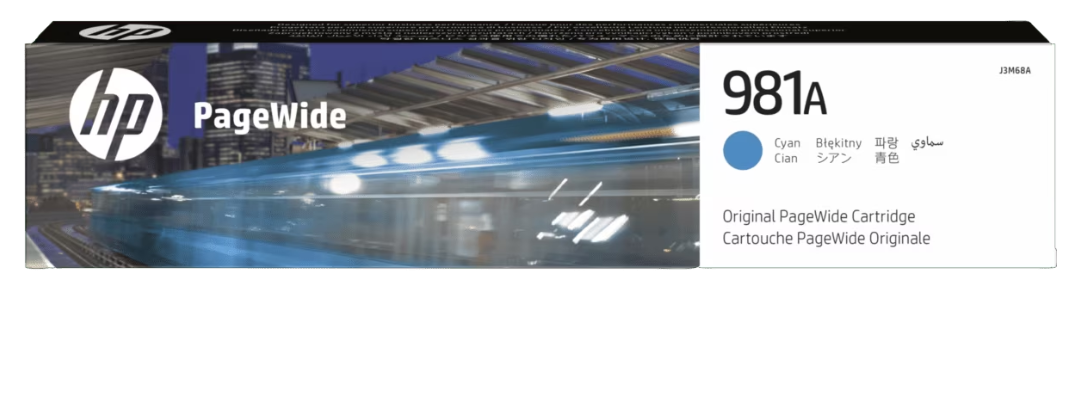J3M68A HP 981A Cyan Original PageWide Cartridge Cartridge Colors: Cyan Print Technology: HP PageWide Page yield colour: ~6,000 pages Product type: Standard Capacity Ink Cartridges