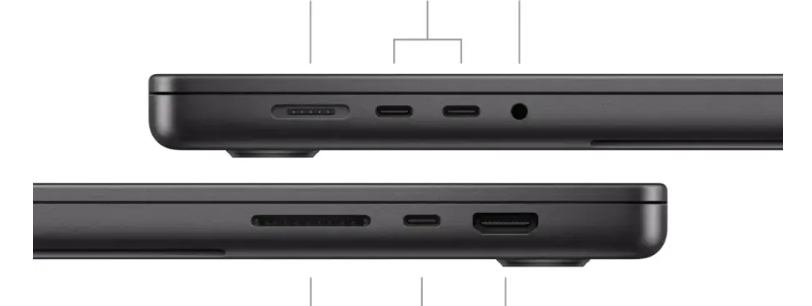 CONNECT IT ALL—The 16-inch MacBook Pro features a MagSafe charging port, SDXC card slot, HDMI port, headphone jack, and three Thunderbolt 5 ports. And it supports up to two external displays with M4 Pro, or up to four with M4 Max.